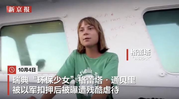 据新京报,10月1日,以色列海军拦截了向加沙运送人道主义物资的“全球坚韧船队”的42艘船只,扣押船队470多名活动人士。10月4日,137名被扣押的活动人士被遣返回土耳其,“环保少女”格蕾塔仍被拘留。一名探访过格蕾塔的瑞典外交官员透露,格蕾塔被关在一个长满床虱的牢房里,出现脱水现象,水和食物摄入量都不足,身上长皮疹。
